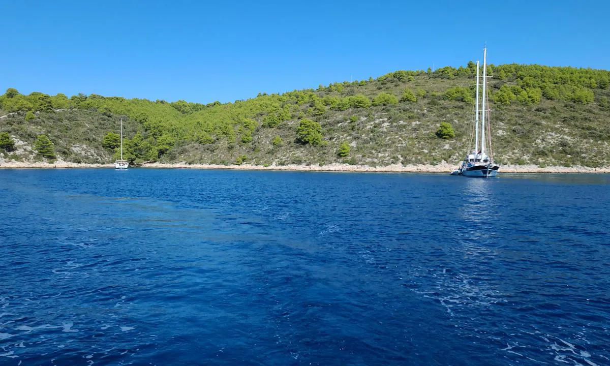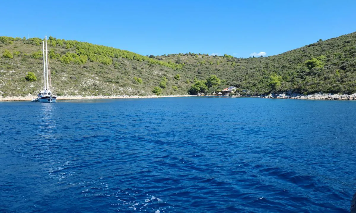 Dro hit for å ankre, men ble møtt av en fyr i jolle som sa at ankring ikke var tillatt. Hele bukta er full av moringsbøyer hvor du fortøyer forut og akter. Organisert av jollefyr. 4 euro per meter båtlengde sent i september. Selvsagt veldig sikkert, men litt campingplass-følelse. En annen jollefyr solgte ferskt brød om morgenen, noe som var hyggelig.